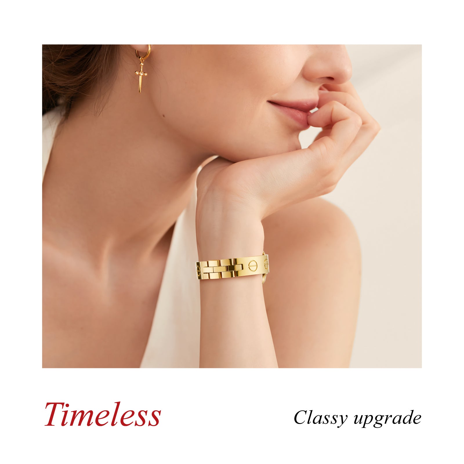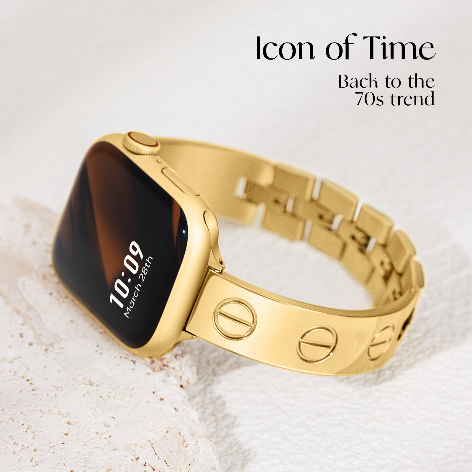 Classic is back. Meet our LOVE Bangle Band — signature motifs carved on the iwatch band bring you back to the 1969 classics. Simple, classic, and sophisticated, the LOVE bangle band for Apple Watch is polished and re-polished to take on a sleek metal sheen. Stainless steel metal bangle with jewel clasp links beautifully adorn your wrist, giving your Apple Watch a classy look on the go.