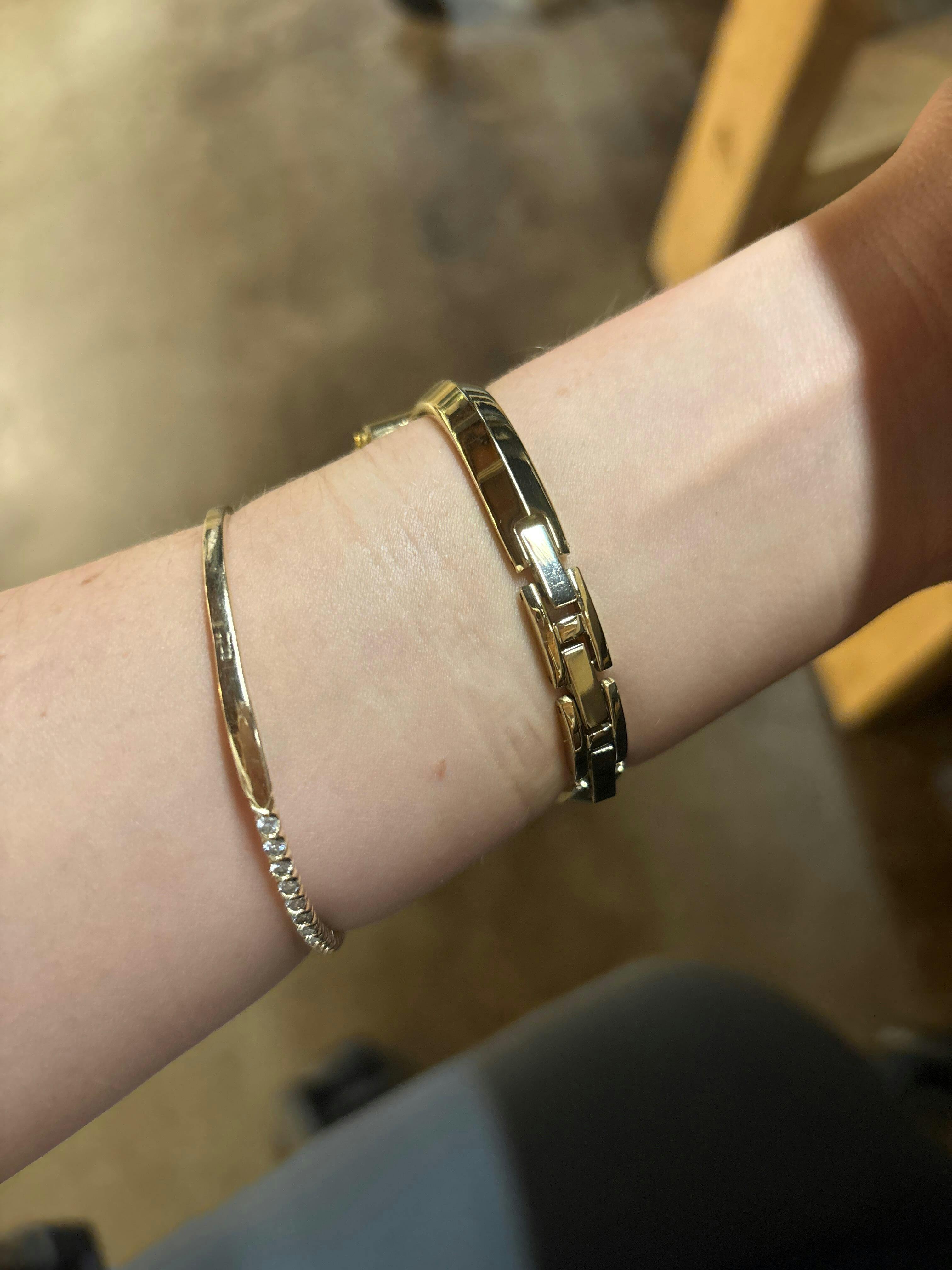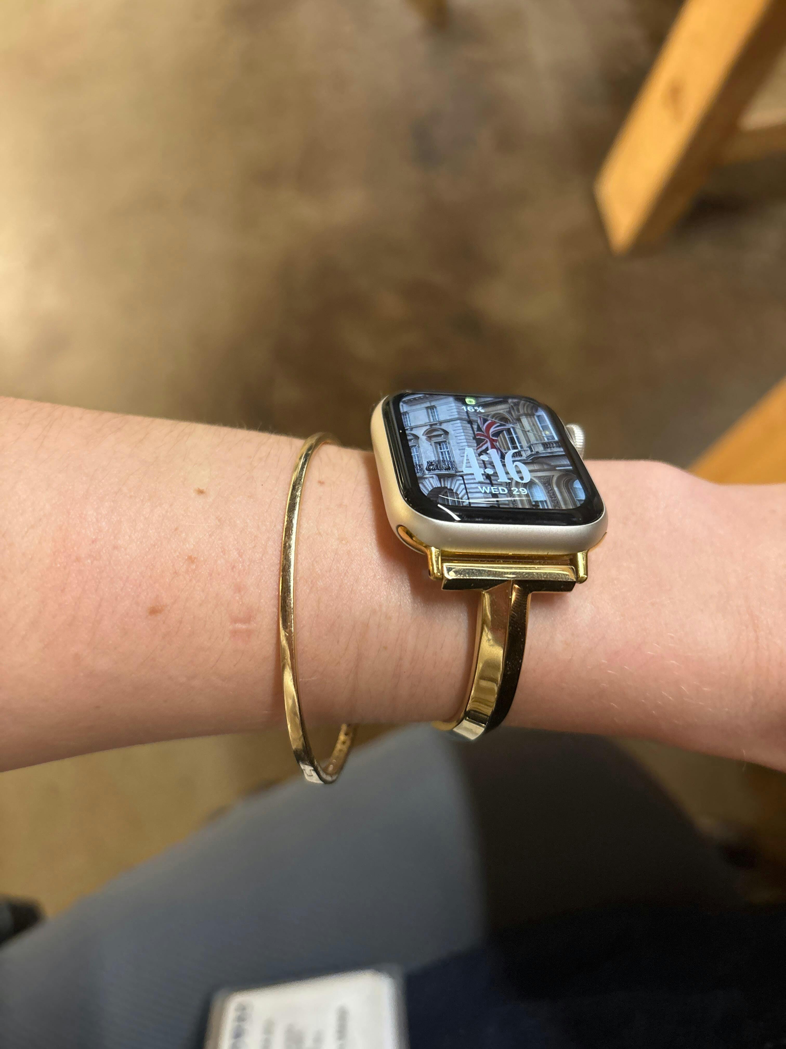 Simple slim design with an aesthetic graphic twist. Tiarra Bracelet is 18K gold-plated (for Gold option) and made from tarnish free stainless steel as its base. Highly reflective finish is triple polished to give a mirror-like sheen. This Apple Watch Bracelet Band is ready to stack with any of your wrist bling for a classy yet understated upgrade.